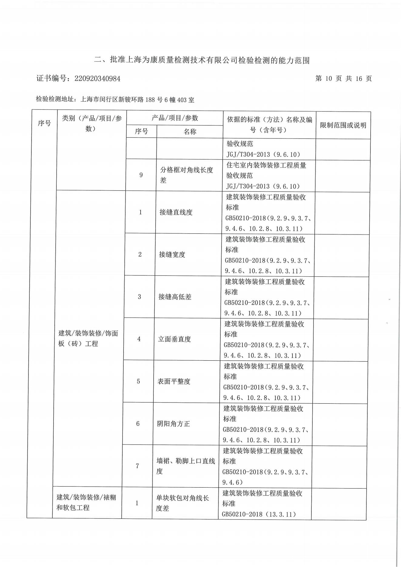 分戶驗(yàn)收要求 分戶驗(yàn)收:即交房前依照相關(guān)標(biāo)準(zhǔn)對(duì)區(qū)域內(nèi)住宅逐套進(jìn)行驗(yàn)收。自2009年10月1日起所有上海市住宅工程強(qiáng)制實(shí)施分戶驗(yàn)收。《上海市工程質(zhì)量分戶驗(yàn)收管理規(guī)定》住宅工程竣工驗(yàn)收前必須依照《住宅工程套內(nèi)質(zhì)量驗(yàn)收規(guī)范》DG/TJ08-2062-2009和現(xiàn)行工程質(zhì)量標(biāo)準(zhǔn)、規(guī)范,對(duì)每戶套內(nèi)的觀感質(zhì)量、使用功能及使用安全進(jìn)行驗(yàn)收。凡未實(shí)施分戶驗(yàn)收的,該工程項(xiàng)目將不得交付使用;服務(wù)范圍 一、裝修房全過(guò)程跟蹤檢查:從毛坯到裝修結(jié)束全過(guò)程跟蹤檢驗(yàn);對(duì)隱蔽工程施工進(jìn)行檢測(cè);對(duì)裝飾 材料進(jìn)行控制;每個(gè)施工節(jié)點(diǎn)作好原始記錄并提出整改意見(jiàn);待整改結(jié)束進(jìn)行復(fù)查,直至符合 要求;最終每戶出具一份檢測(cè)報(bào)告。 二、裝修房竣工驗(yàn)收:主要對(duì)安全、使用功能及表面觀感質(zhì)量進(jìn)行檢測(cè);每個(gè)施工節(jié)點(diǎn)作好原始記錄并提出整改意見(jiàn);待整改結(jié)束進(jìn)行復(fù)查,直至符合要求;最終每戶出具一份檢測(cè)報(bào)告。 三、毛坯竣工驗(yàn)收:主要對(duì)安全、使用功能及表面觀感質(zhì)量進(jìn)行檢測(cè);每個(gè)施工節(jié)點(diǎn)作好原始記錄并提出整改意見(jiàn);待整改結(jié)束進(jìn)行復(fù)查,直至符合要求;最終每戶出具一份檢測(cè)報(bào)告。 四、個(gè)人交房驗(yàn)房檢測(cè)。 建設(shè)工程分戶驗(yàn)收檢測(cè)參考標(biāo)準(zhǔn) DG/TJ08-2062-2017 《住宅工程套內(nèi)質(zhì)量驗(yàn)收規(guī)范 》 DB/T 31/30-2003《住宅裝飾裝修驗(yàn)收標(biāo)準(zhǔn)》 GB50209-2002《建筑地面工程施工質(zhì)量驗(yàn)收規(guī)范》 GB50210-2001《建筑裝飾裝修工程質(zhì)量驗(yàn)收規(guī)范》 GB20242-2002《建筑給排水及采暖工程施工質(zhì)量驗(yàn)收規(guī)范》 GB50300-2001《建筑工程施工質(zhì)量驗(yàn)收統(tǒng)一標(biāo)準(zhǔn)》 GB50303-2002《建筑電氣工程施工質(zhì)量驗(yàn)收規(guī)范》 套內(nèi)質(zhì)量檢測(cè)(一房一驗(yàn))內(nèi)容 檢測(cè)內(nèi)容 建筑尺寸 室內(nèi)地面:水泥砂漿地面、木、竹地板,板塊地面 室內(nèi)頂棚:頂棚抹灰、吊頂工程 室內(nèi)墻面:墻面抹灰、飾面板(磚)墻面、涂飾工程、裱糊工程、軟包工程 建筑門窗 樓梯與護(hù)欄 細(xì)部工程:櫥、柜,窗簾盒、窗臺(tái)板、門窗套、可折裝式隔斷、淋浴房 給排水與燃?xì)猓菏覂?nèi)給水、室內(nèi)排水、衛(wèi)生器具、燃?xì)夤艿? 通風(fēng)與空調(diào):送排風(fēng)和防排煙、空調(diào)工程、 室內(nèi)電氣:燈具安裝、開(kāi)關(guān)、插座,分戶配電箱、室內(nèi)配線、等電位聯(lián)結(jié) 弱電工程:有線電視安裝工程、電話、信息網(wǎng)絡(luò)安裝工程,訪客對(duì)講安裝工程、安防報(bào)警系統(tǒng) 太陽(yáng)能熱水系統(tǒng) 室內(nèi)環(huán)境評(píng)價(jià)